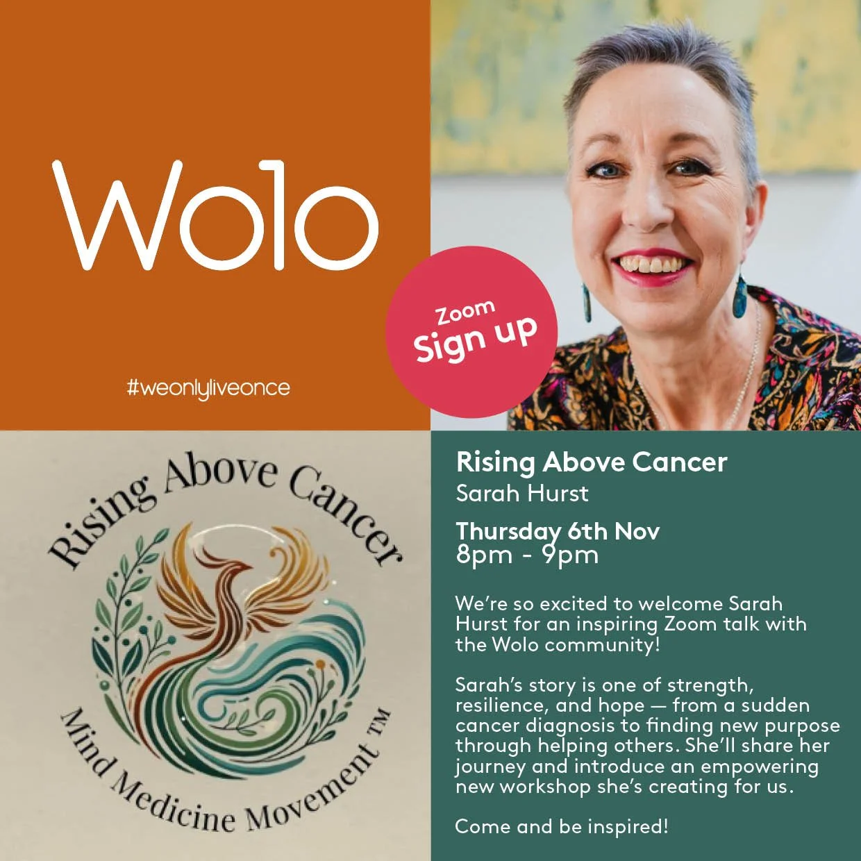 oin us on Zoom as Sarah Hurst shares her powerful journey with ovarian cancer and introduces a new Wolo workshop about finding strength, hope, and connection.